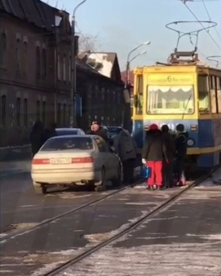 Инцидент произошел на улице Борисенко в районе остановки «Клубная». Пассажиры трамвая были вынуждены «вручную» двигать автомобиль, чтобы трамвай продолжил движение.