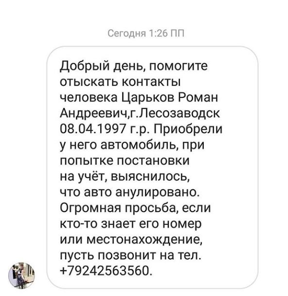 Сообщается, что приморцы разыскивают некого Романа, который проживает в городе Лесозаводск и недавно продал молодым людям автомобиль. При постановке транспортного средства на учет выяснилось, что авто аннулировано. Теперь бывшего владельца разыскивают через соцсети.