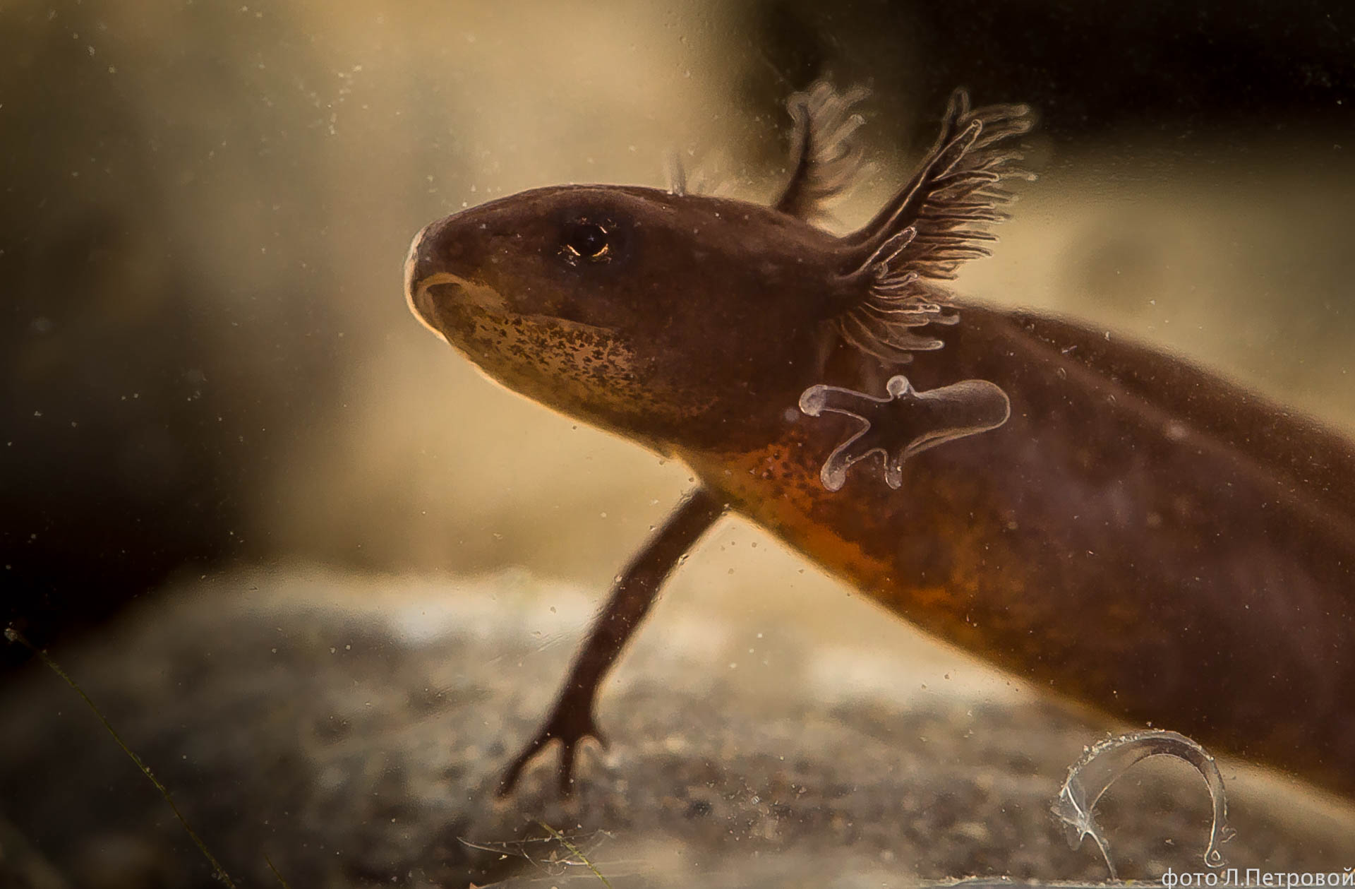 Маленькому тритону уже около трех недель. Прикрепленную к водоросли кладку икры специалисты заметили, когда переселяли из закрывающегося на реставрацию террариума пятерых взрослых китайских огненнобрюхих тритонов. От них тут же убрали растение с кладкой: тритоны - хищники, могут съесть и икру, и малышей.