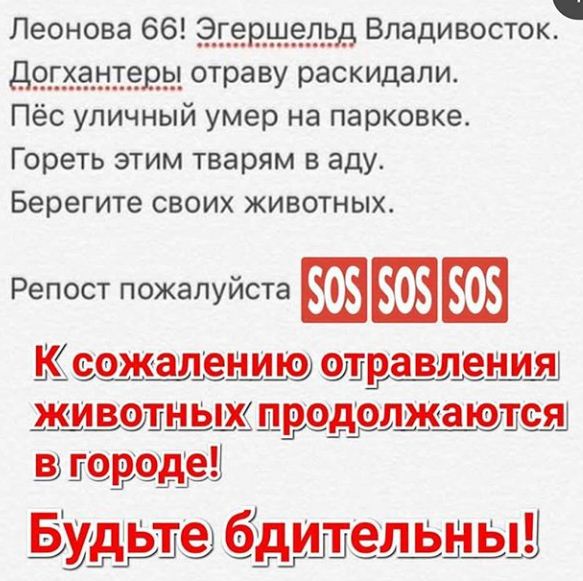 Во Владивостоке догхантеры продолжают травить собак, сообщает РИА VladNews со ссылкой на паблик dps_vdk.