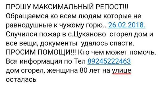 В социальных сетях распространили сообщение о том, что 80-летней женщине, проживающей в доме, который сгорел минувшей ночью, требуется материальная помощь.