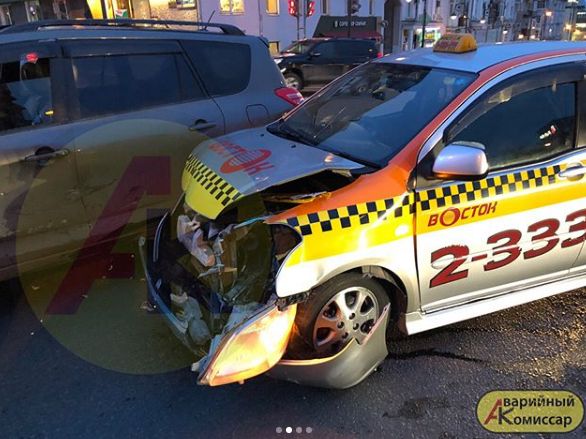 По информации очевидцев, в районе улицы Океанский проспект, 16 водитель такси выехал на перекрёсток на запрещающий сигнал светофора и совершил столкновение с автомобилем Toyota RAV4. В результате происшествия пострадали 2 пассажира такси.