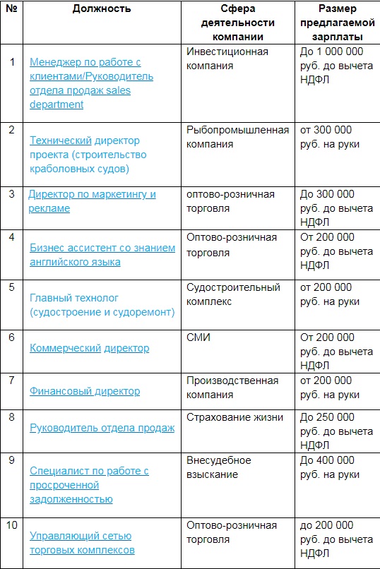 Другими выгодными вакантными должностями являются бизнес ассистент со знанием английского языка, главный технолог в судостроительный комплекс, коммерческий и финансовый директора и управляющий сетью торговых комплексов. Зарплата на этих работах будет около 200 тысяч рублей.