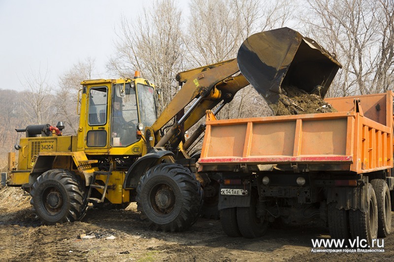 Бригады рабочих и спецтехника собирают и вывозят загрязненный грунт. 6 километров побережья Амурского залива от станции Санаторная до мыса Клыкова загрязнено мазутом.