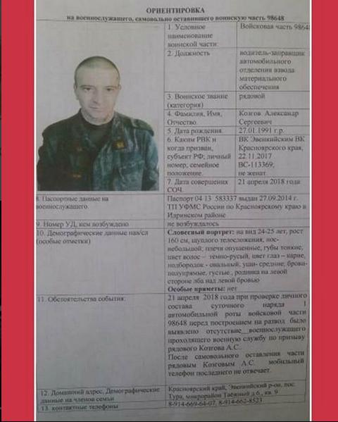 В Приморье ищут солдата, ушедшего в самоволку: призывник из Красноярского края пропал в ночь на 21 апреля из военной части в селе Чернышевка, сообщает РИА VladNews со ссылкой на arstv. Приметы: на вид около 25 лет, рост 160 см, щуплого телосложения, плечи опущенные, нос небольшой, губы тонкие, волос темно-русый, глаза карие, подбородок овальный, уши средние, брови полупрямые, густые, родинка на левой стороне лба над левой бровью.