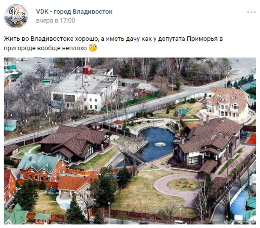 В подписи к фотографии говорится: «Жить во Владивостоке хорошо, а иметь дачу, как у депутата Приморья, в пригороде вообще неплохо».