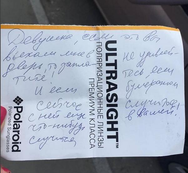 Неизвестный автомобилист оставил на лобовом стекле автомобиля жительницы Приморья записку с угрозами, заставив девушку сильно понервничать. С просьбой найти автора записки девушка обратилась к интернет-сообществу, сообщает РИА VladNews со ссылкой на dpskontrol_125rus.