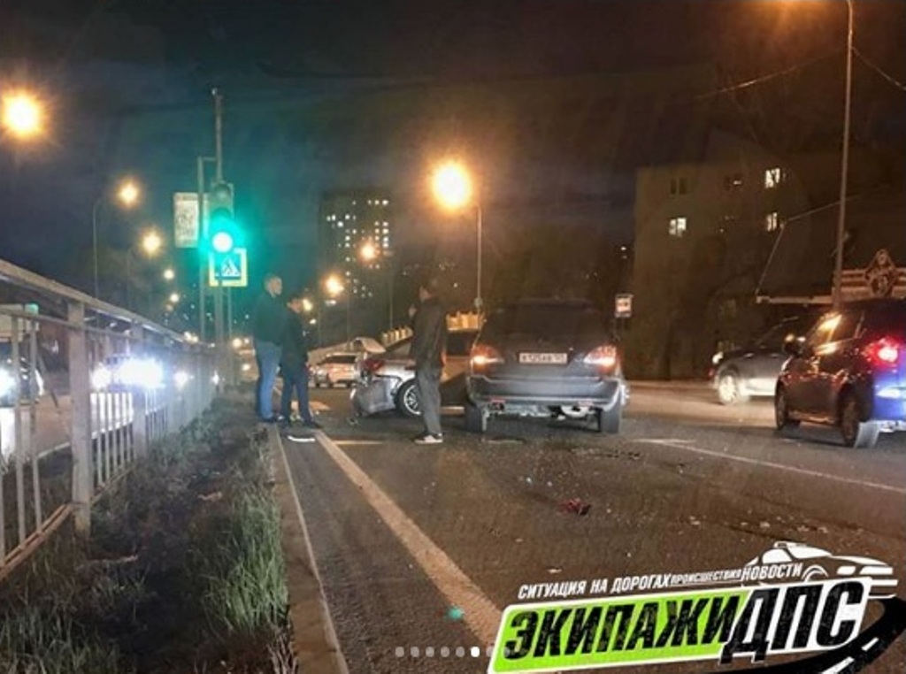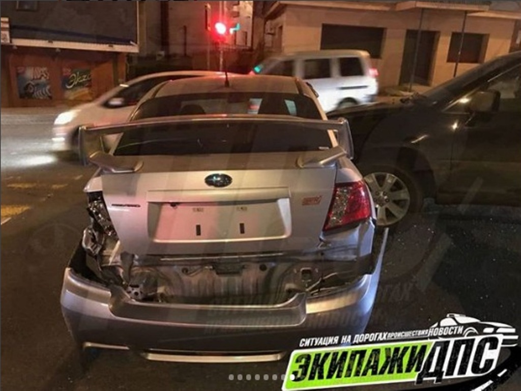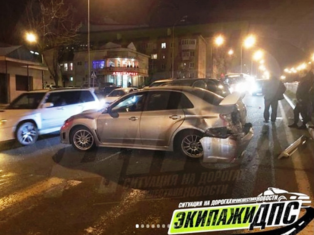 В результате удара автомобиль Toyota Harrier отбросило на Subaru Impreza, который от удара отлетел в леерное ограждение, после чего иномарку развернуло на 180 градусов и в неё вновт врезается Harrier.