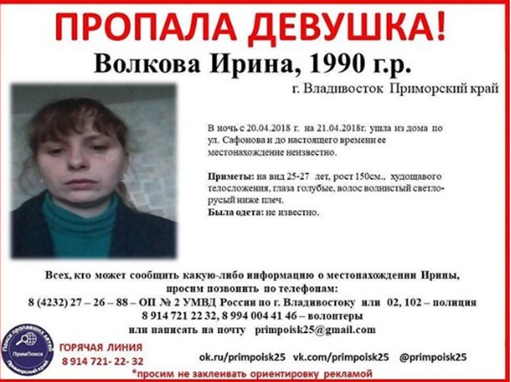 Во Владивостоке при странных обстоятельствах пропала Волкова Ирина, 1990 года рождения, сообщает РИА VladNews со ссылкой на dpskontrol_125rus.