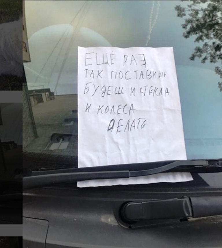 Как сообщают местные жители, водитель припарковал свое транспортное средство около двери подъезда, чем перегородил проход, в результате чего под дворниками появилось объявление «Ещё раз так поставишь, будешь и стекла и колёса делать».