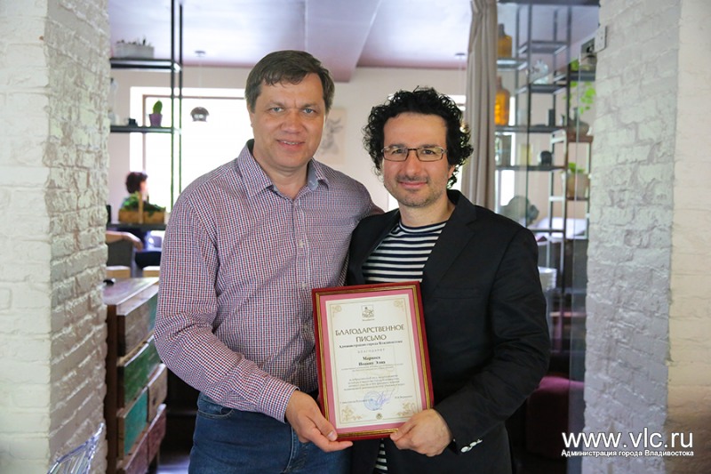 Глава Владивостока встретился с известным кипрским композитором Мариосом Иоанну Элиа, который на днях успешно выступил в краевой филармонии с военно-морской симфонией «Варяг». Виталий Веркеенко вручил композитору благодарность за работу «Звуки Владивостока» от имени главы города, сообщает РИА VladNews со ссылкой на пресс-службу администрации Владивостока.