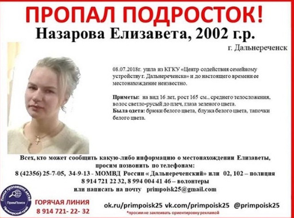 Всех, кто может сообщить какую-либо информацию о местонахождении Елизаветы, просим позвонить в полицию или сообщить волонтёрам.