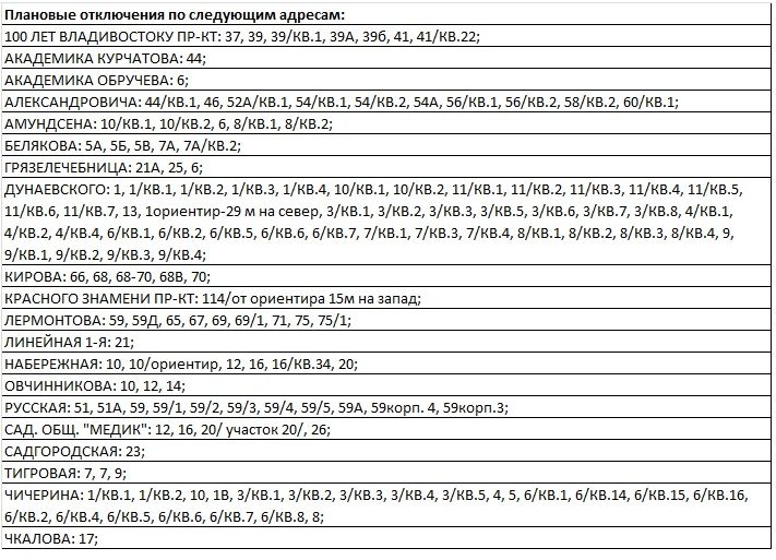 Время проведения плановых работ с 9:00 до 17:00. Длительность каждого отключения от 2-х до 8-ми часов.