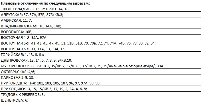 Время проведения плановых работ с 9:00 до 17:00. Длительность каждого отключения от 2-х до 8-ми часов.