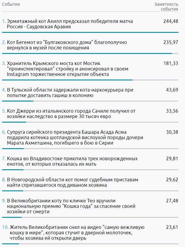 Специально к Всемирному дню кошек, который был 8 августа, компания «Медиалогия» составила рейтинг котиков в российских СМИ, сообщает РИА VladNews.