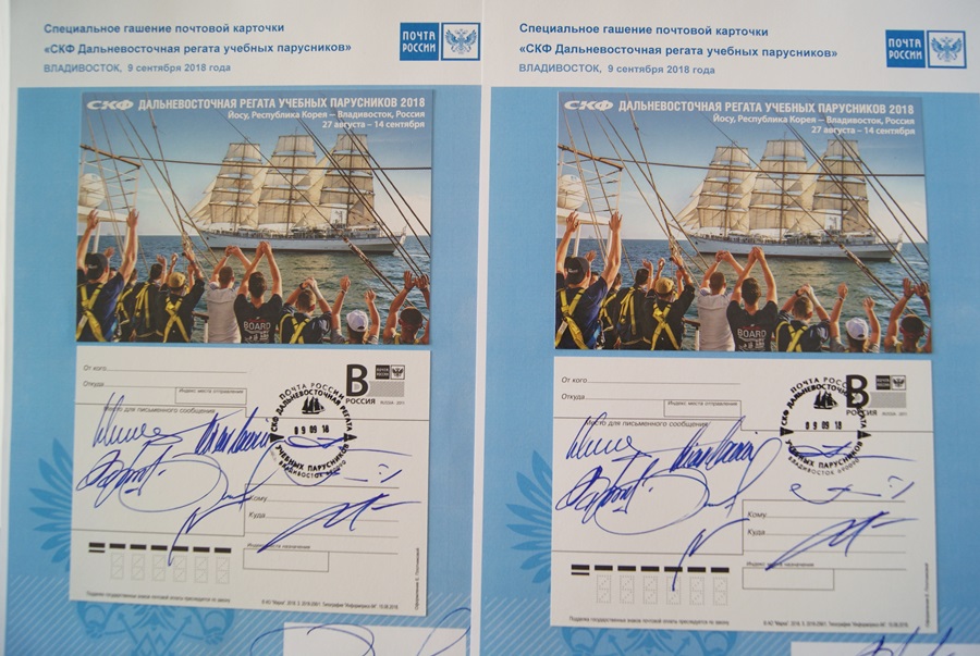 Торжественная церемония гашения почтовой карточки состоялась на паруснике «Надежда». В мероприятии приняли участие глава Владивостока Виталий Веркеенко, председатель «СКФ Дальневосточной регаты учебных парусников» Эйнар Корвин, первый заместитель генерального директора – главный инженер ПАО «Совкомфлот» Игорь Тонковидов, исполнительный директор Ассоциации учебных парусников России Алексей Николаев, заместитель руководителя Федерального агентства морского и речного транспорта Александр Пошивай, директор Дальневосточного бассейнового филиала ФГУП «Росморпорт» Виктор Ванюков, ректор Морского государственного университета им. адмирала Г.И. Невельского Сергей Огай и директор Макрорегиона Дальний Восток Почты России Виталий Смирнов. Организаторы регаты лично поставили свои подписи и оттиск почтового штемпеля на новых почтовых открытках.