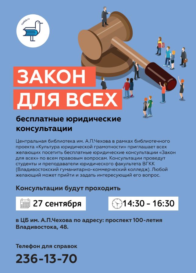 МБУК «Владивостокская централизованная библиотечная система» приглашает всех желающих, вход свободный. Юридические консультации будут проходить два раза в месяц по четвергам с 14:30 до 16:30. Ближайшая состоится уже 27 сентября.