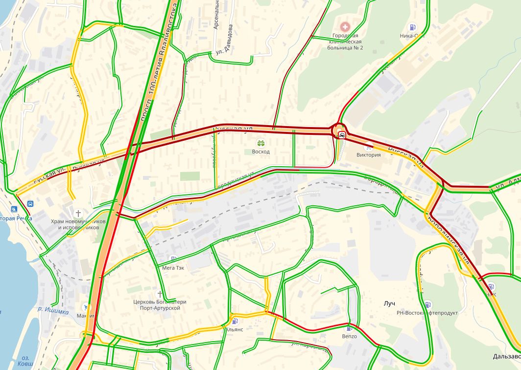 На улице Русской движение блокировано в обе стороны, транспортные средства двигаются со скоростью 2 км/ч.