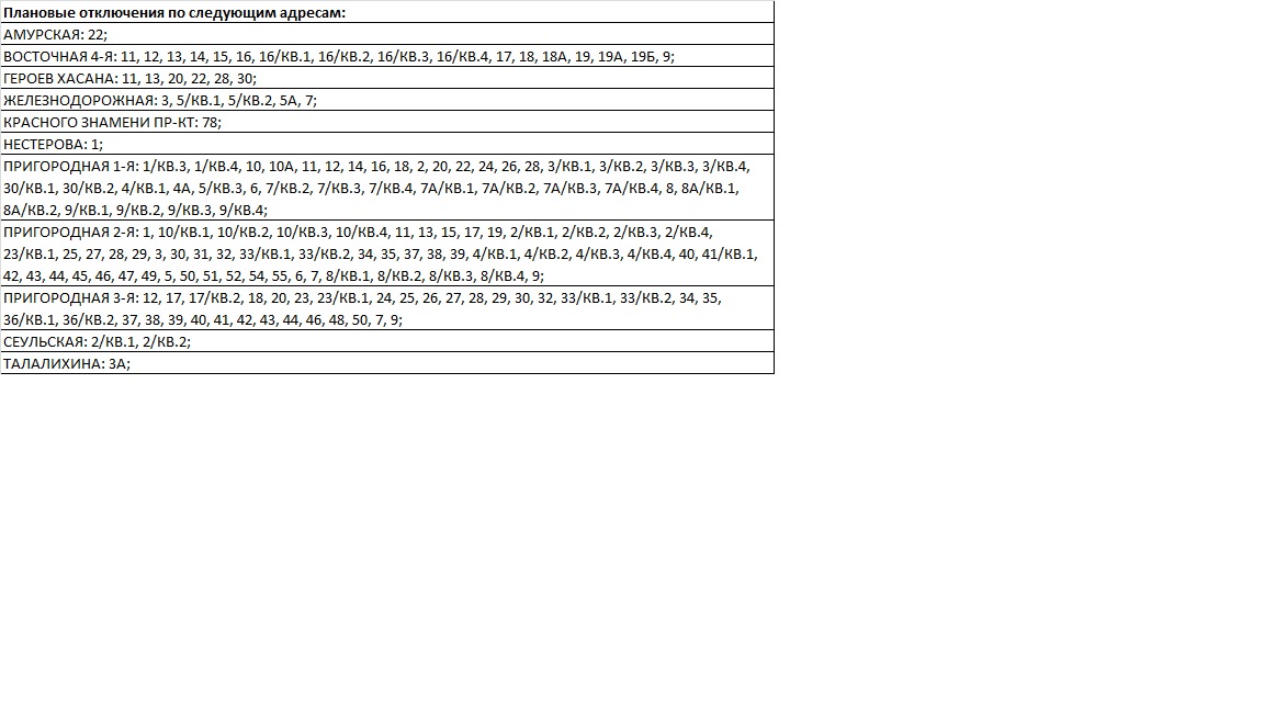Время проведения плановых работ с 9:00 до 17:00. Длительность каждого отключения от 2-х до 8-ми часов.