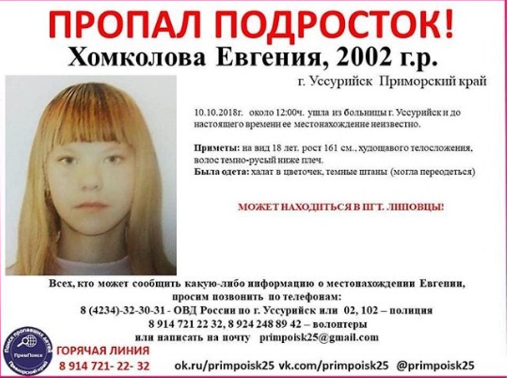 В Приморье разыскивают Хомколову Евгению, 2002 года рождения, проживающую в Уссурийске, сообщает РИА VladNews со ссылкой на dpscontrol.