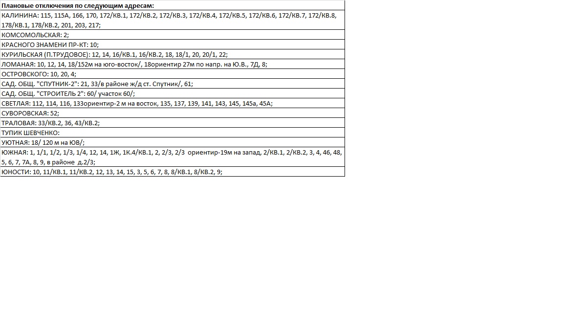 Время проведения плановых работ с 9:00 до 17:00. Длительность каждого отключения от 2-х до 8-ми часов.