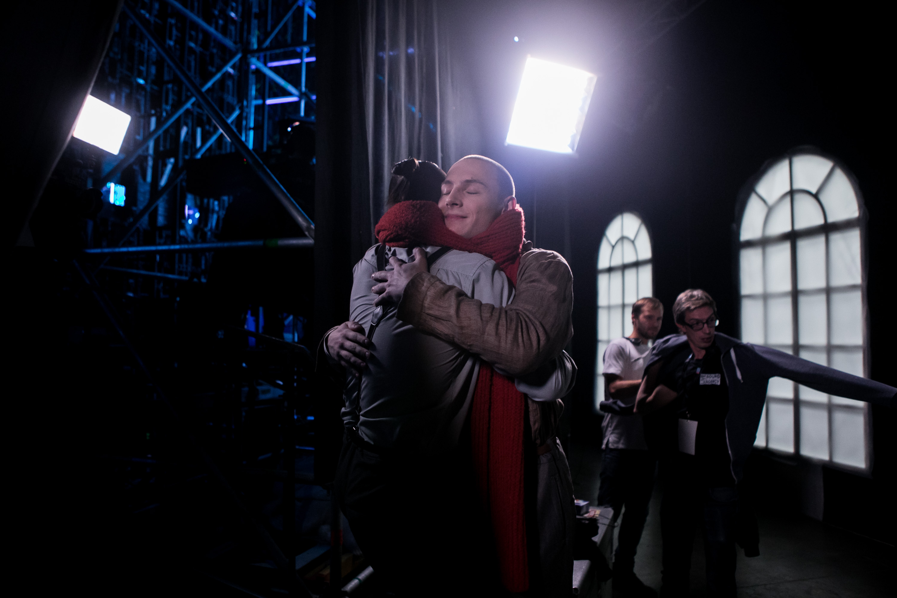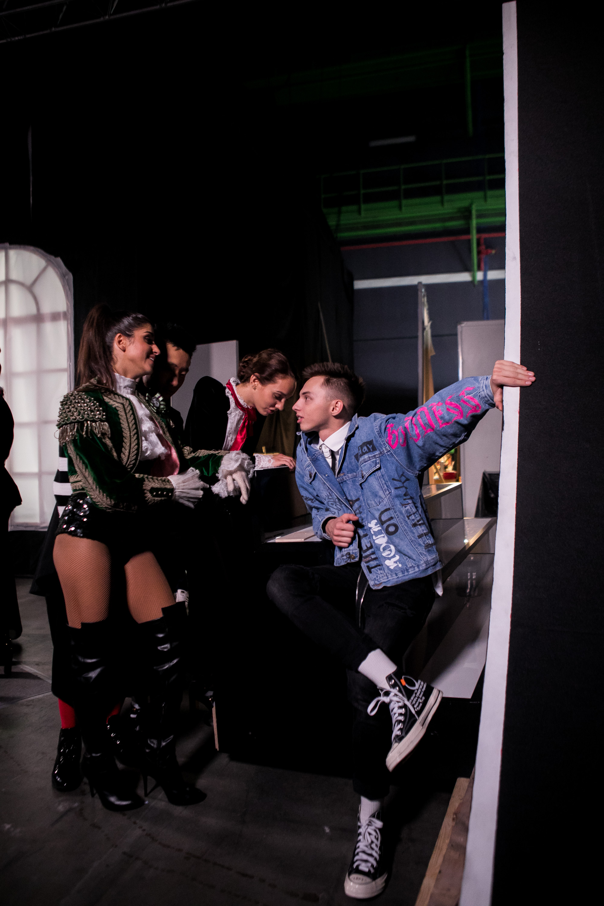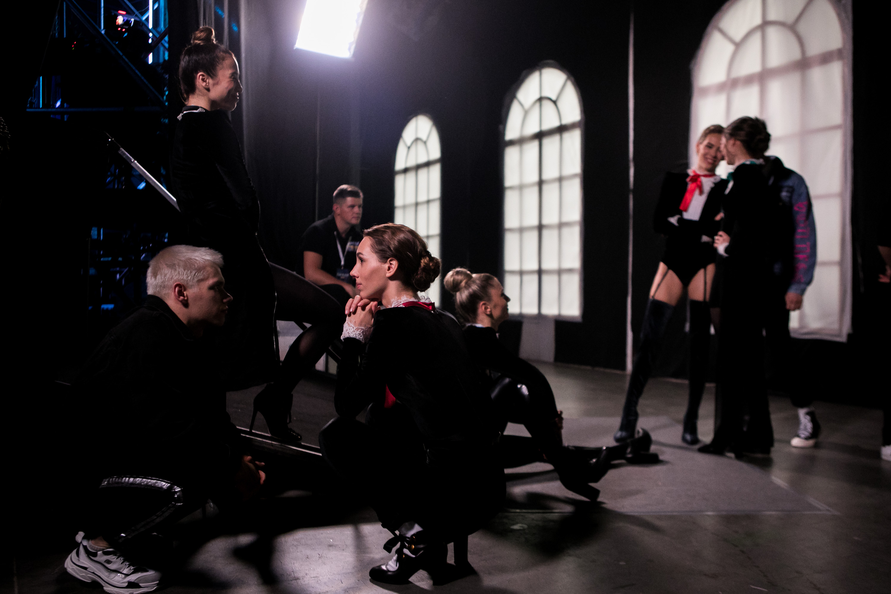 После того, как зрители разогреты, начинается запись так называемой «открывашки» - первого концертного номера, в котором принимают участие все команды. Нам повезло вдвойне – на этом концерте вместе с танцовщиками на сцену вышли и наставники проекта. После номера Мигель, Егор Дружинин и Татьяна Денисова удаляются за кулисы, чтобы привести себя в порядок перед дальнейшими съемками.