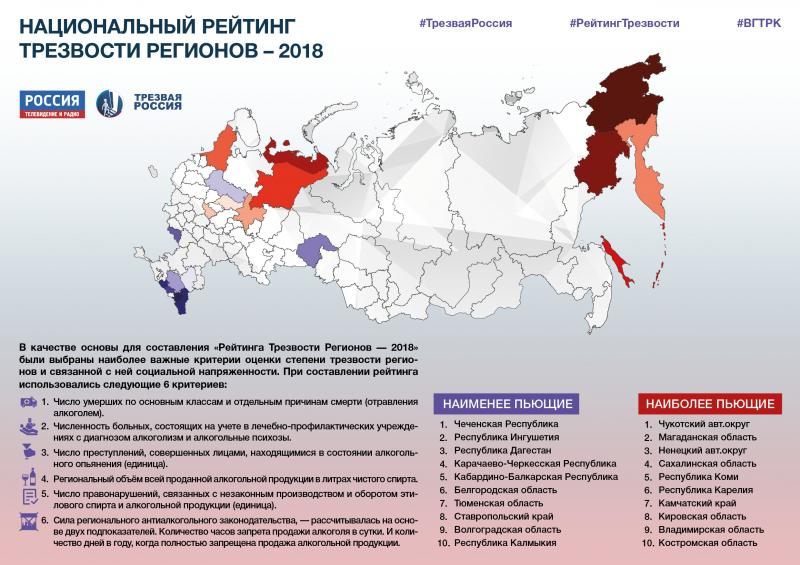 «Рейтинг Трезвости Регионов – 2018» - это целенаправленный научно-практический мониторинг антиалкогольной работы каждого из 85-ти субъектов Российской Федерации, который выявляет и сравнивает масштабы негативных последствий от незаконного оборота алкогольной продукции и злоупотребления алкоголя среди граждан, а также показывает динамику за последние 4 года.