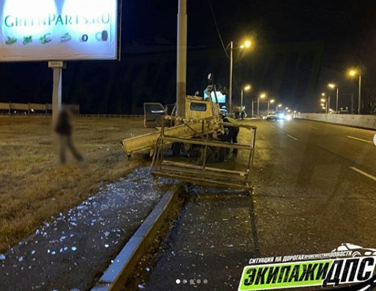 При столкновении со столбом освещения, находившиеся в грузовике люди вылетели из кабины через левую дверь.