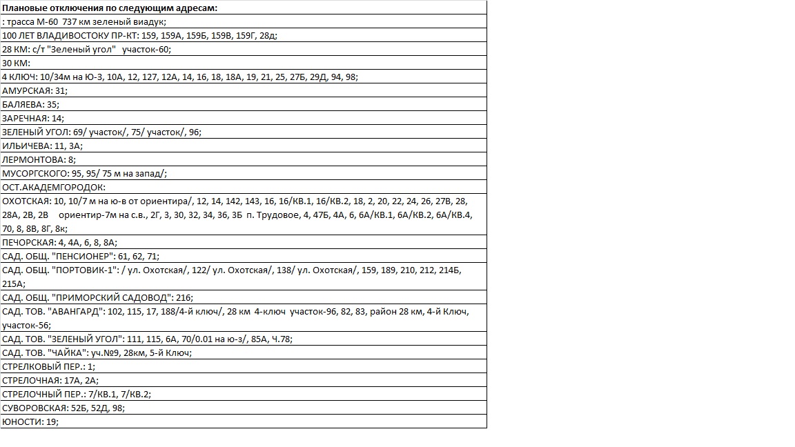 Время проведения плановых работ с 9:00 до 17:00. Длительность каждого отключения от 2-х до 8-ми часов.