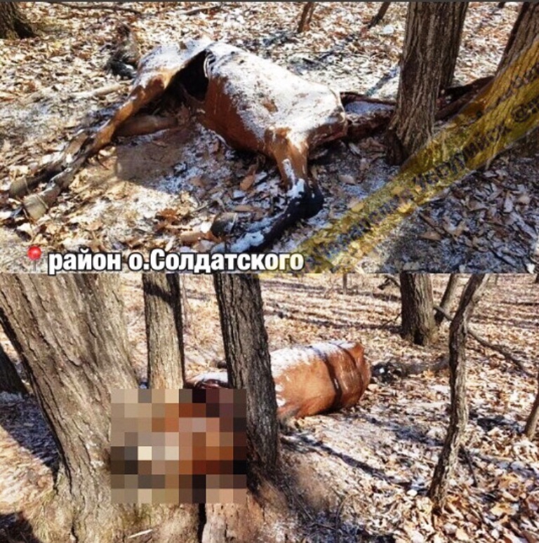 Так, мужчина, гуляя со своим питомцем недалеко от Солдатского озера, обнаружил труп лошади. По предварительным данным, животное застряло между двух деревьев, в результате чего погибло.