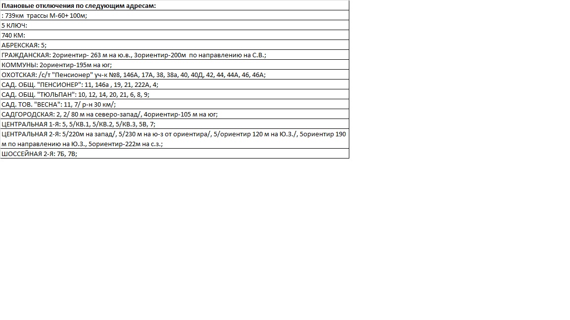 Время проведения плановых работ с 9:00 до 17:00. Длительность каждого отключения от 2-х до 8-ми часов.