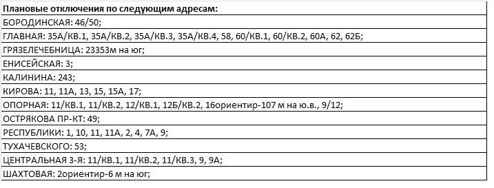 Время проведения плановых работ с 9:00 до 17:00. Длительность каждого отключения от 2-х до 8-ми часов.