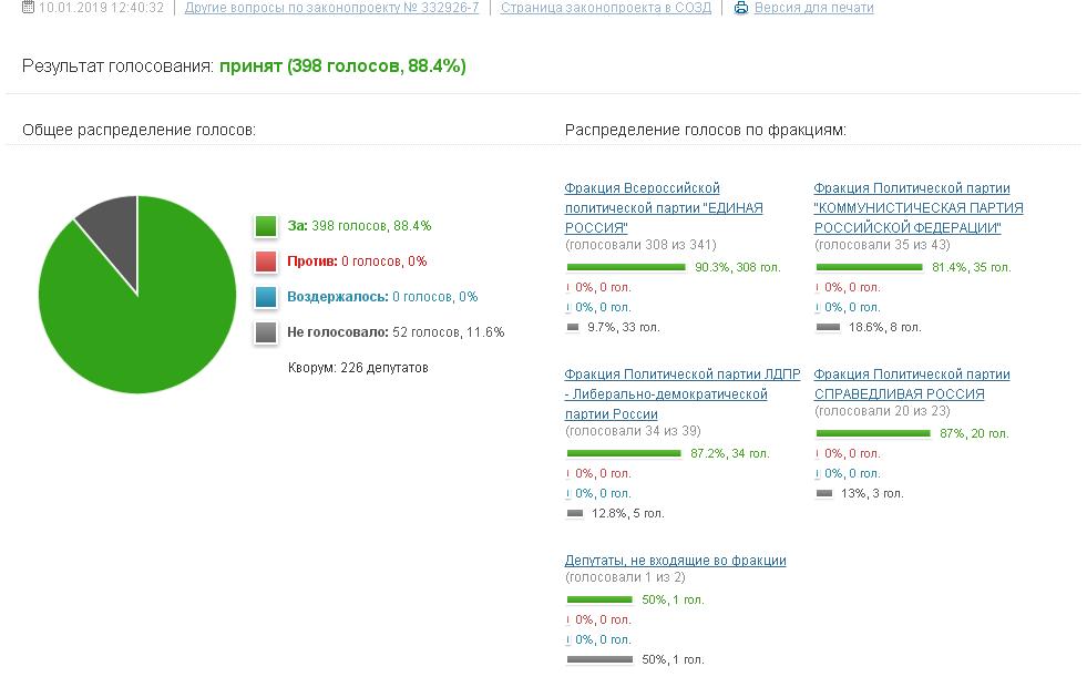 За законопроект проголосовали все присутствовавшие депутаты (88,4%, или 398 человек). "Против" не проголосовал никто, воздержавшихся не было. Участие в голосовании приняли представители всех парламентских партий, а также один из двух кандидатов, не входящих в парламентскую фракцию.