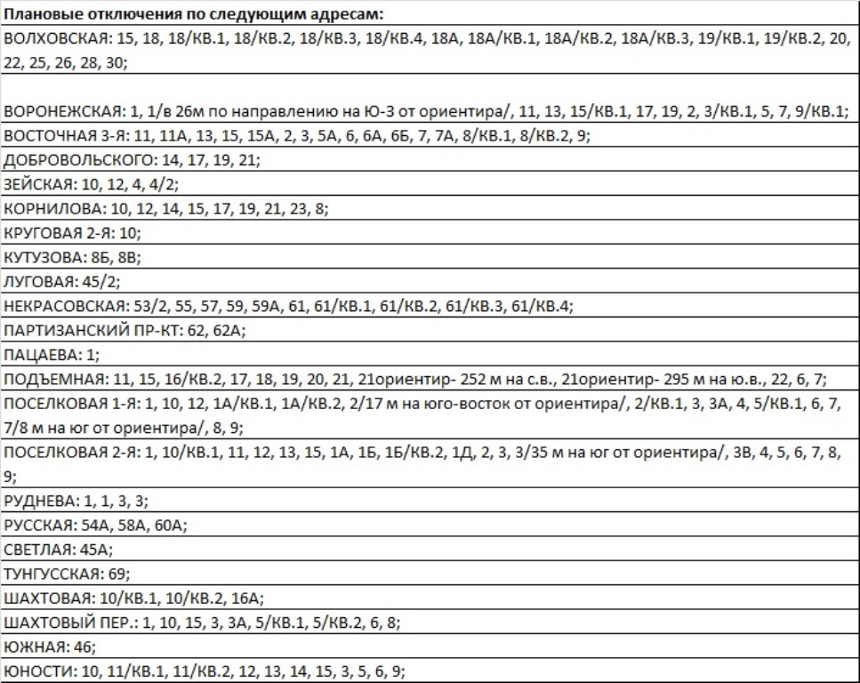 Время проведения плановых работ с 9:00 до 17:00. Длительность каждого отключения от 2-х до 8-ми часов.