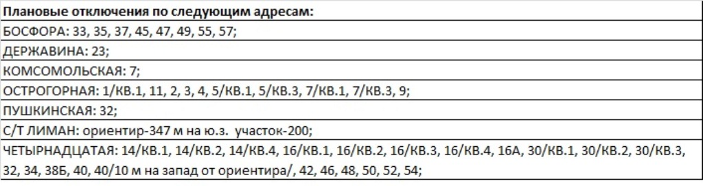 Время проведения плановых работ с 9:00 до 17:00. Длительность каждого отключения от 2-х до 8-ми часов.