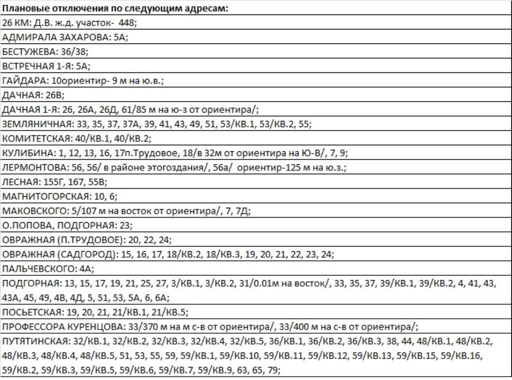 Время проведения плановых работ с 9:00 до 17:00. Длительность каждого отключения от 2-х до 8-ми часов.
