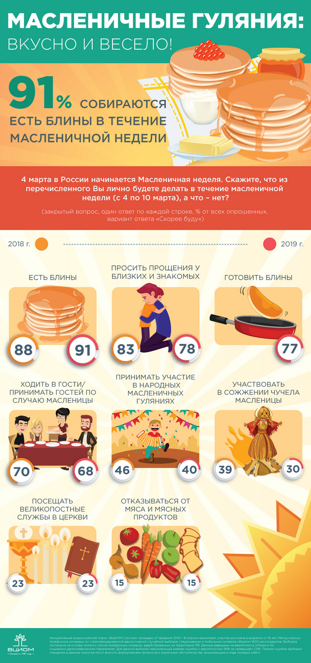 В России полным ходом идёт Масленичная неделя. ВЦИОМ спросил у жителей страны, что из перечисленного они делают или будут делать с 4 по 10 марта, а что - нет, сообщает РИА VladNews.