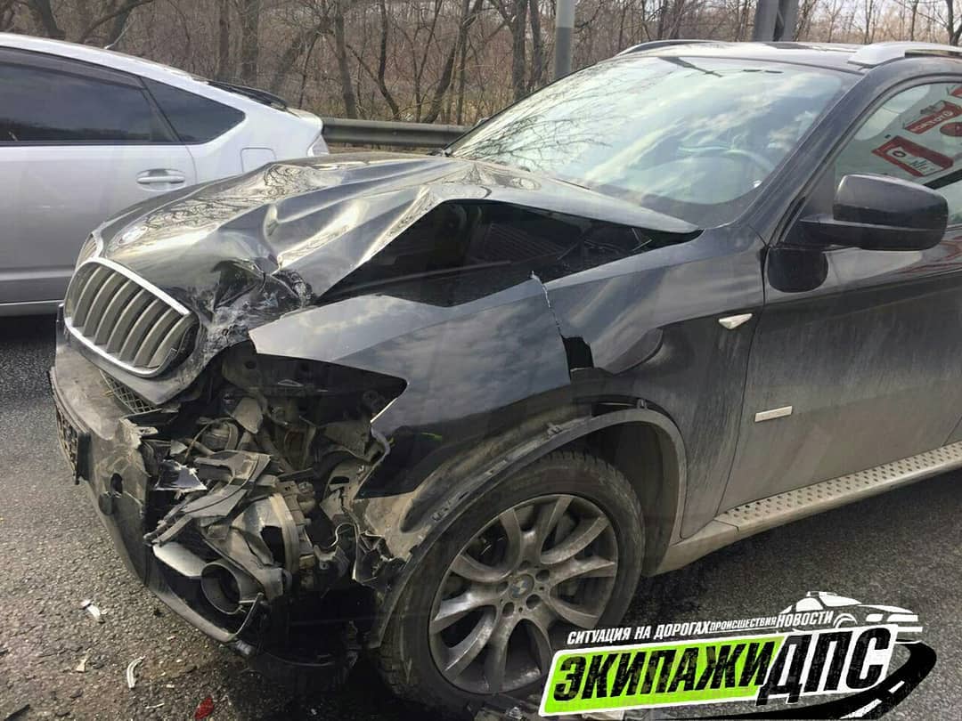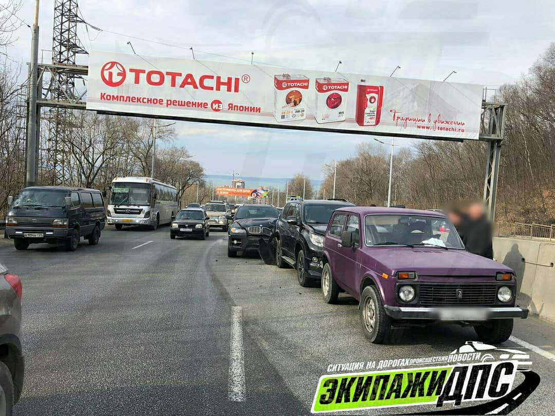 Поломка «Нивы» спровоцировала массовое ДТП. В российский автомобиль сзади въехал внедорожник Toyota Land Cruiser Prado, в него BMW X6, а в BMW влетел Hyundai.