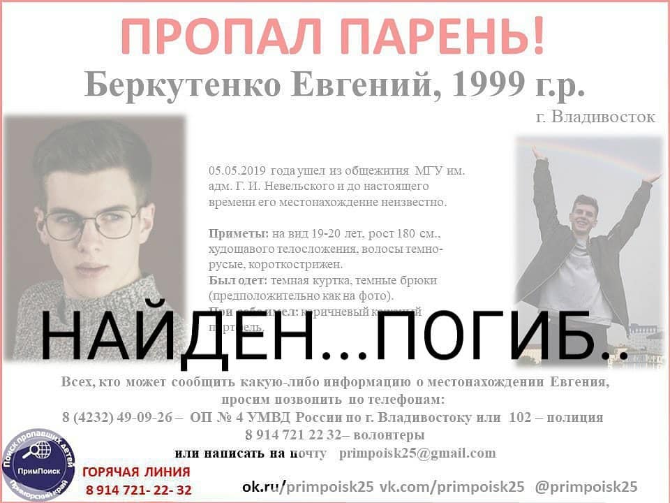 Пропавший во Владивостоке Евгений Б. найден погибшим, сообщает РИА VladNews со ссылкой на Instagram-паблик «ПримПоиск».