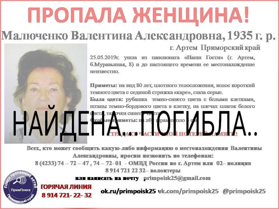 Пропавшая в Артёме Валентина Александровна М. найдена погибшей, сообщает РИА VladNews со ссылкой на Instagram-паблик «ПримПоиск».