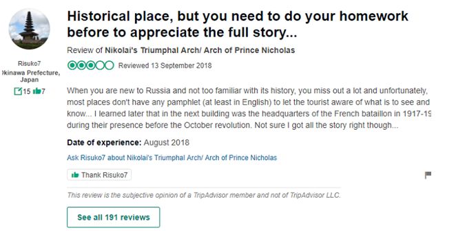 “Когда Россия для вас в новинку, и вы не особо знакомы с ее историей, то многое упускаете. К сожалению, в большинстве мест нет брошюр (по крайней мере, на английском языке), чтобы турист знал, что посмотреть, получил какую-то информацию. Позже я узнал, что в следующем здании (напротив Триумфальной арки - ред.) в 1917-1919 гг. находился штаб французских батальонов, которые располагались здесь до Октябрьской революции. Хотя, я не уверен, что всё правильно понял...” (турист из Японии)
