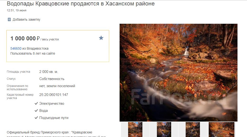 На сайте популярной приморской интернет-барахолки появилось объявление о продаже Кравцовских водопадов, сообщает РИА VladNews.