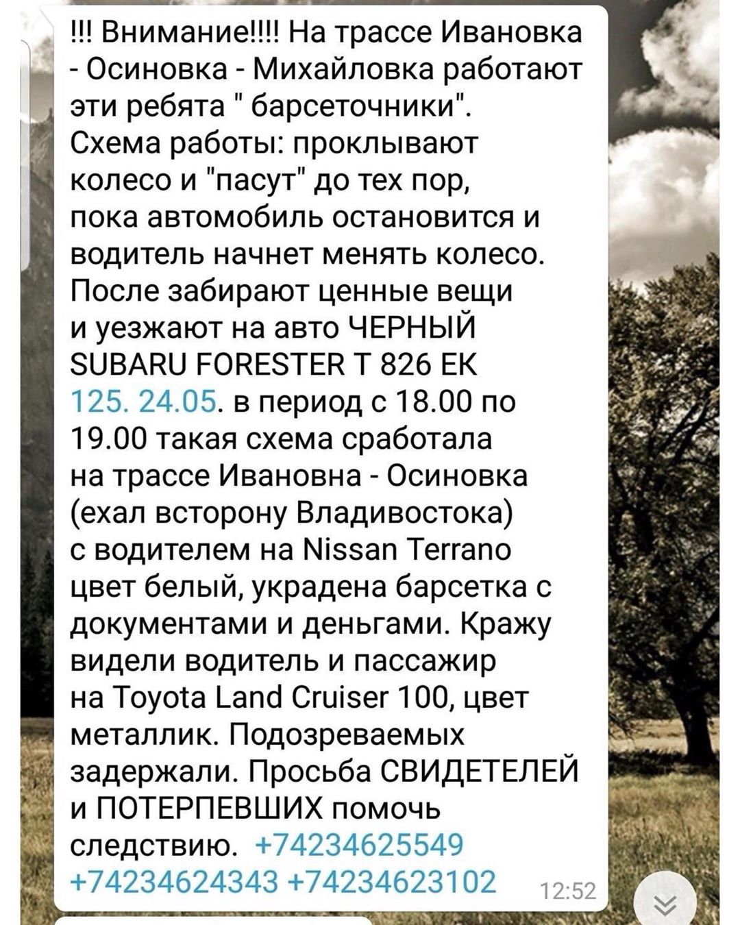 Так, на трассе Ивановка-Осиновка-Михайловка орудуют, так называемые, «барсеточники». По словам пострадавшим, злоумышленники изначально прокалывают колёса на автомобилях и начинают следить за ними, пока водитель не оставит транспортное средство, чтобы поменять колесо.