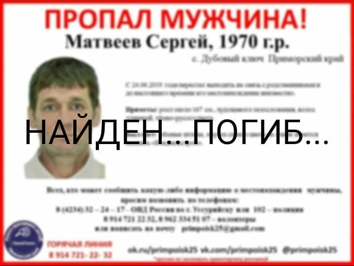 Пропавший в Приморье Сергей М. найден погибшим, сообщает РИА VladNews со ссылкой на Instagram-паблик «ПримПоиск».