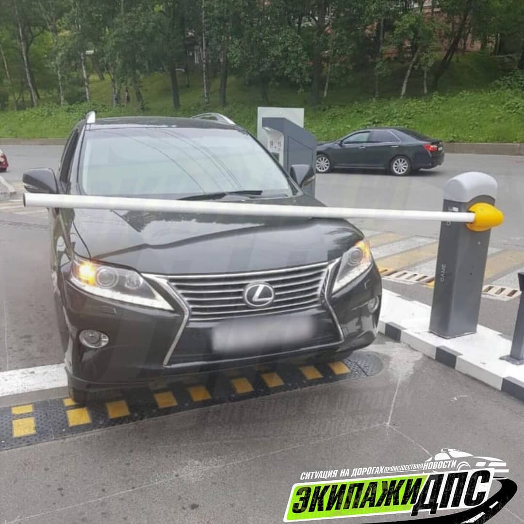 Так, Lexus, заезжая на парковку торгового центра, получил шлагбаумом по капоту.