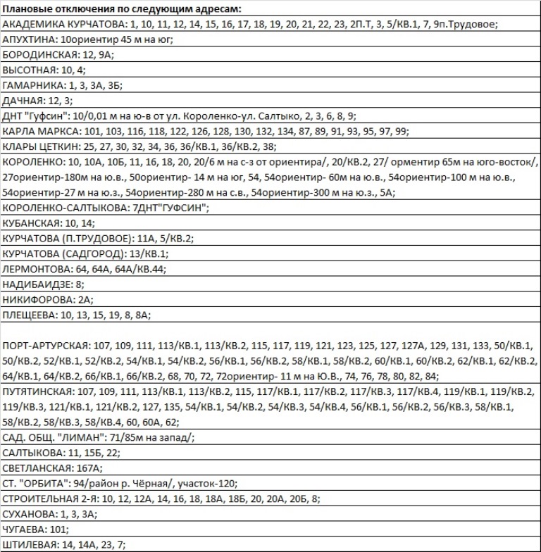 Время проведения плановых работ с 9:00 до 17:00. Длительность каждого отключения от двух до восьми часов.