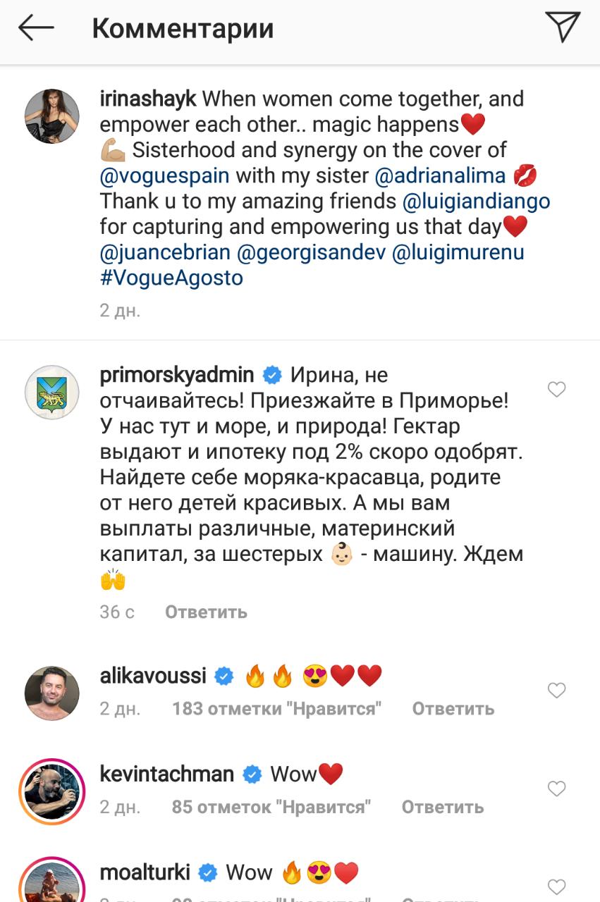 На страничке Ирины Шейк в социальной сети Инстаграм краевые власти оставили комментарий с очень «заманчивым» предложением: