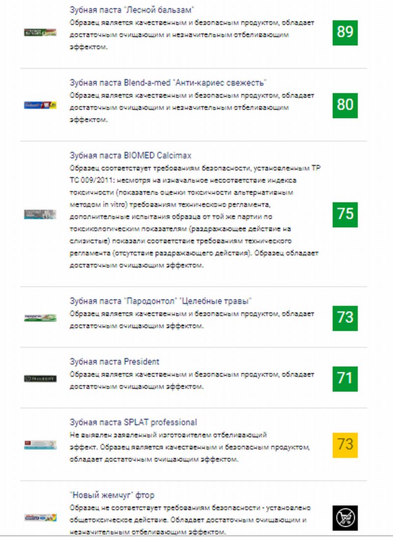 Данные образцы были проверены по более чем 50 параметрам, в том числе на наличие токсичных соединений. По данному параметру проверку не прошли пасты «Новый жемчуг» и Biomed — их показатели токсичности оказались за пределами норматива.