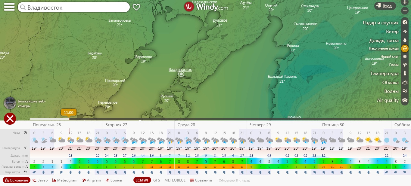 По информации портала windy.com, в 12 часов во Владивостоке может выпасть до 0,3 мм осадков.
