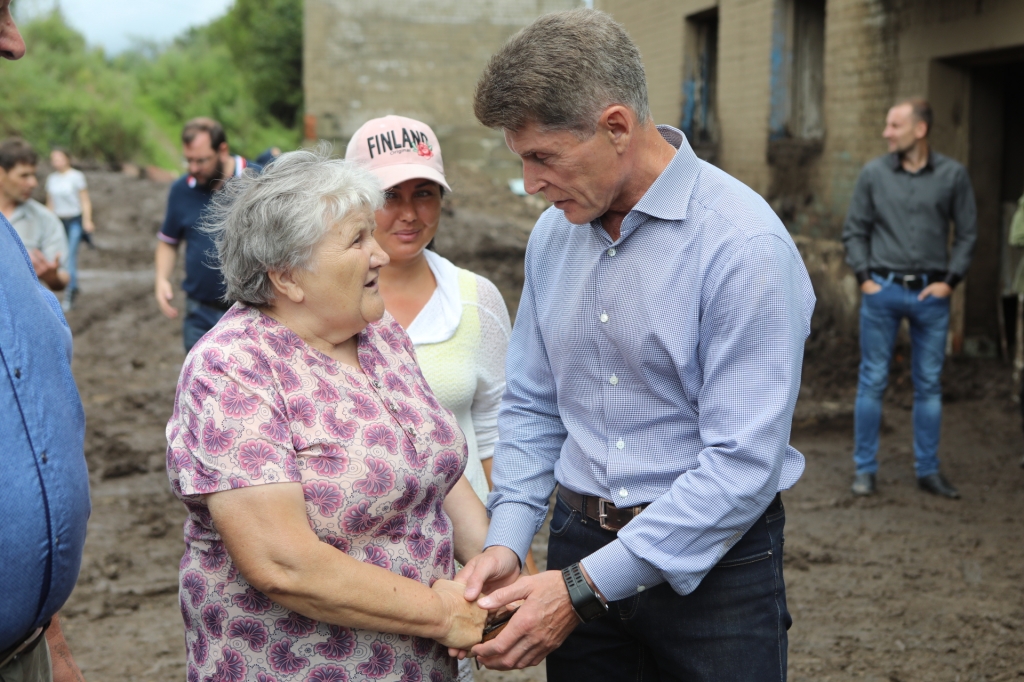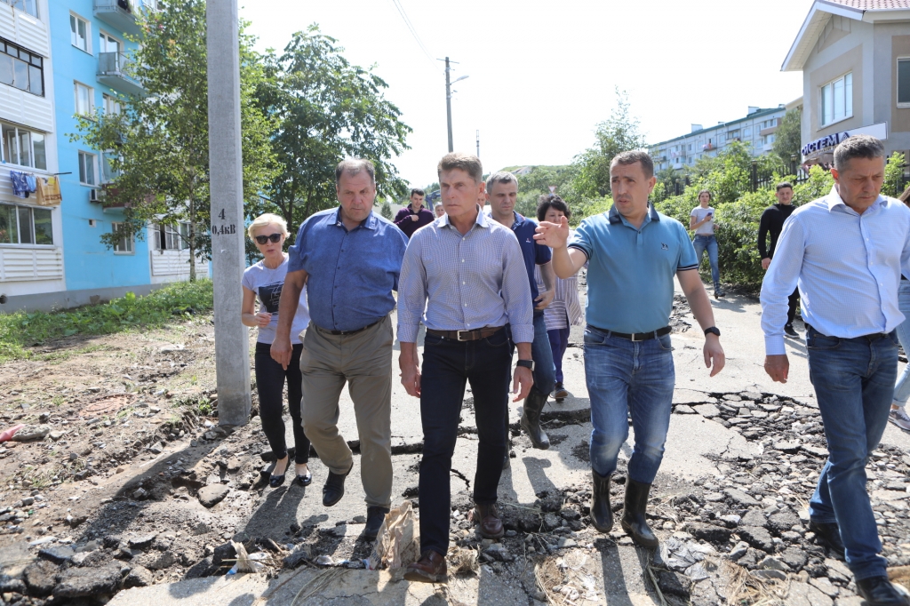 Также Олег Кожемяко осмотрел состояние дорог в поселке Славянка. Прошедшие дожди нанесли большой ущерб дорожному покрытию, тротуарам. Сейчас в поселке чистят ливневки, пожарные откачивают воду из подвалов домов.